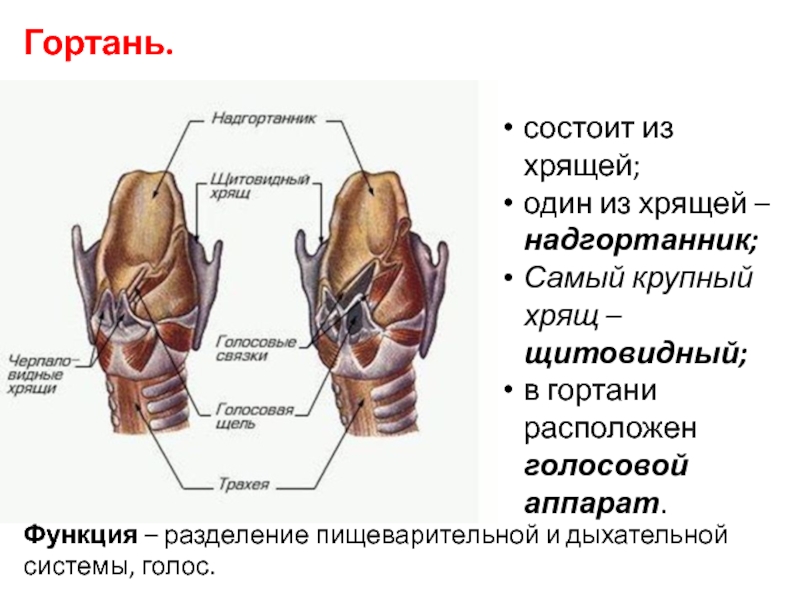 Функция – разделение пищеварительной и дыхательной системы, голос.