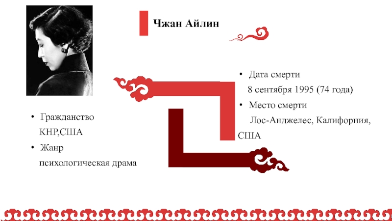 Чжан АйлинГражданство	  КНР,СШАЖанр	  психологическая драмаДата смерти	  8 сентября 1995 (74 года)Место смерти