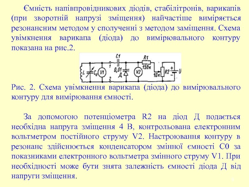 Слайд 9 Ємність напівпровідникових діодів, стабілітронів, варикапів (при зворотній напрузі зміщення) найчастіше