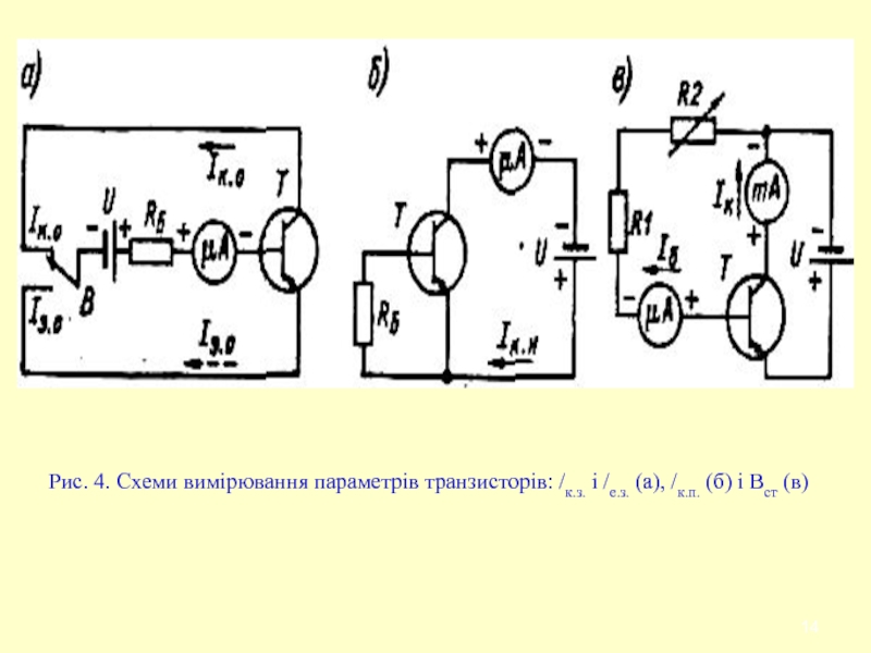 Слайд 14Рис. 4. Схеми вимірювання параметрів транзисторів: /к.з. і /е.з. (а),