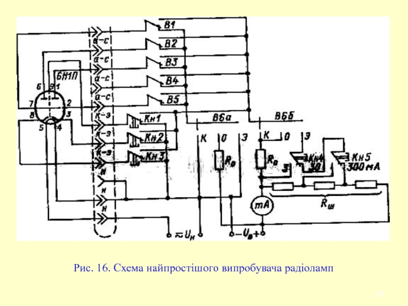 Слайд 25Рис. 16. Схема найпростішого випробувача радіоламп