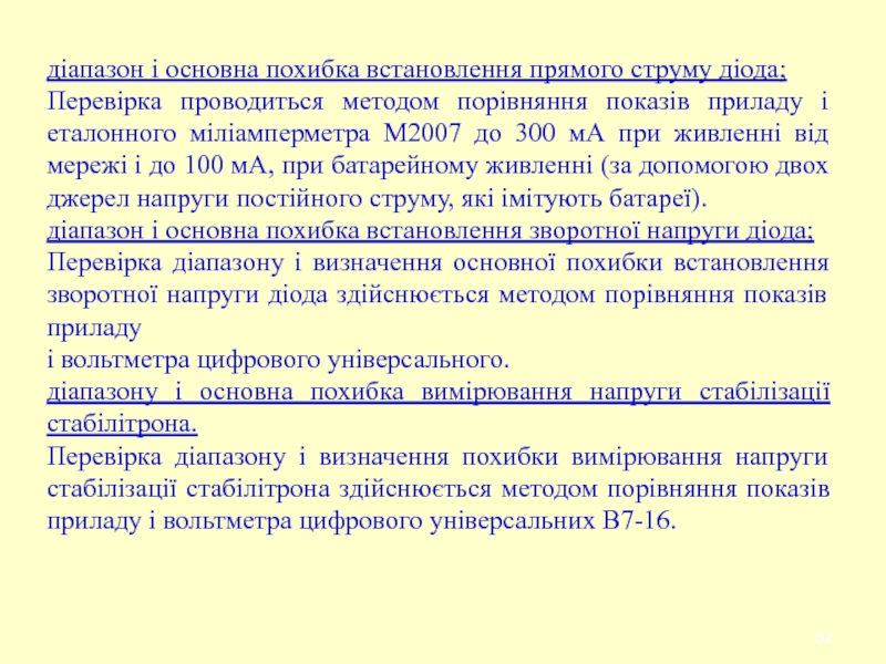 Слайд 32діапазон і основна похибка встановлення прямого струму діода;