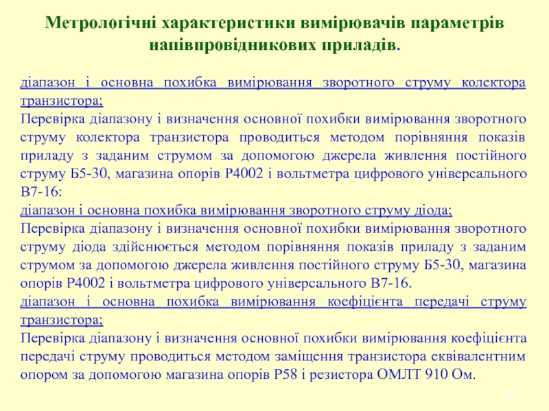 Слайд 30Метрологічні характеристики вимірювачів параметрів напівпровідникових приладів.
