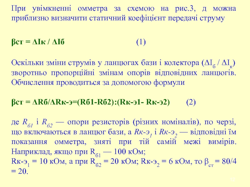 струмів у ланцюгах бази і колектора (Іб / Ік) зворотньо пропорційні змінам опорів відповідних ланцюгів. Обчислення проводиться за допомогою формули