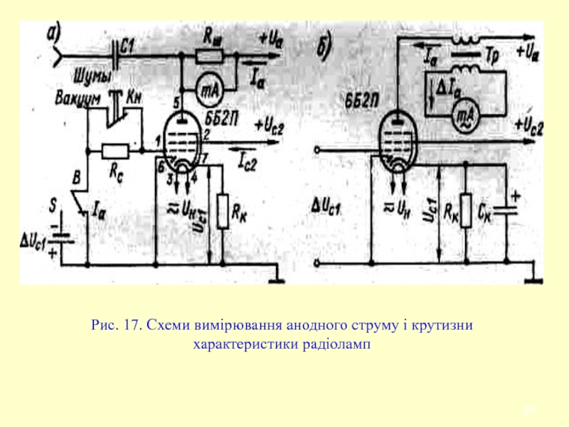 Слайд 26Рис. 17. Схеми вимірювання анодного струму і крутизни