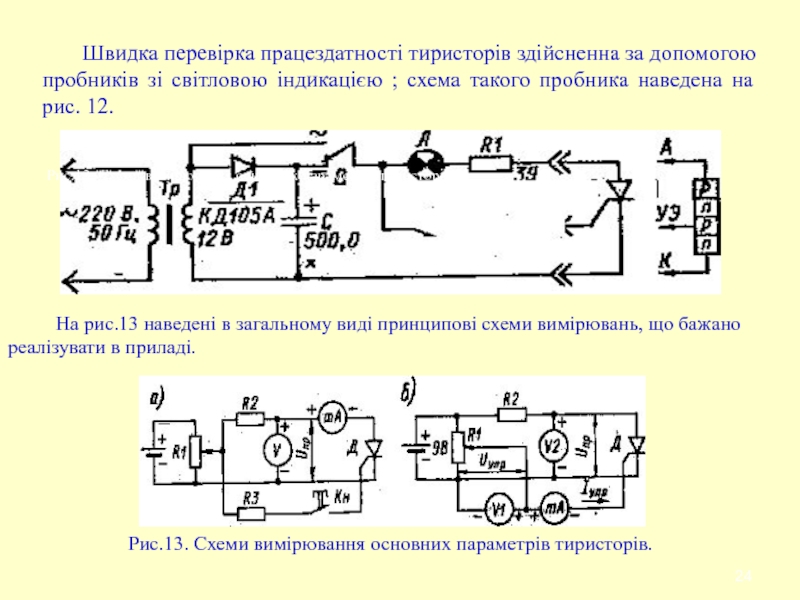 Слайд 24 Швидка перевірка працездатності тиристорів здійсненна за допомогою пробників зі світловою