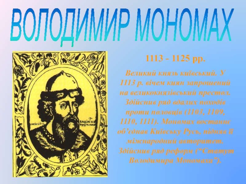 ВОЛОДИМИР МОНОМАХ1113 - 1125 рр.Великий князь київський. У 1113 р. вічем киян запрошений на великокнязівський престол. Здійснив
