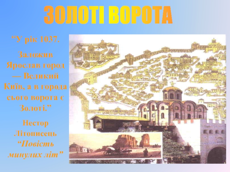 ЗОЛОТІ ВОРОТА“У рік 1037. Заложив Ярослав город — Великий Київ, а в города сього ворота є Золоті.”Нестор