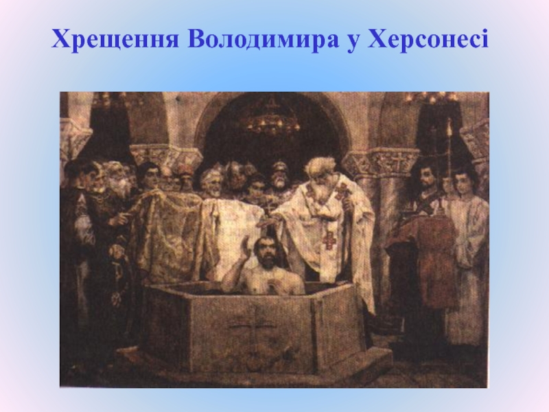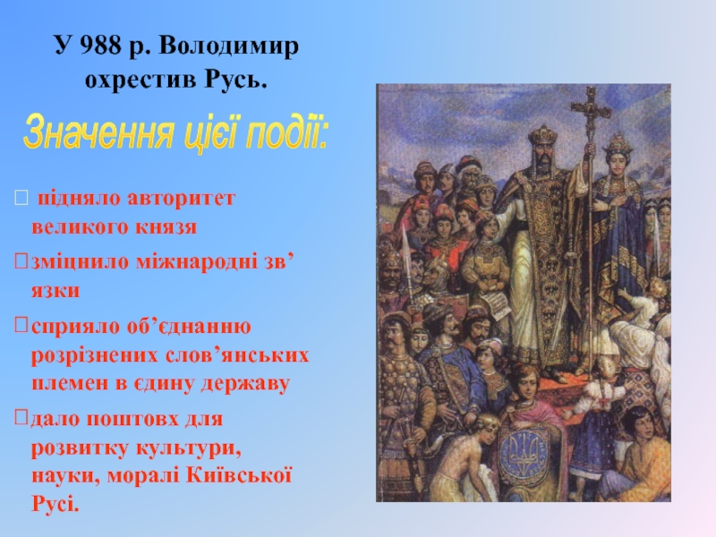 У 988 р. Володимир охрестив Русь.Значення цієї події: підняло авторитет великого князязміцнило міжнародні зв’язкисприяло об’єднанню розрізнених слов’янських