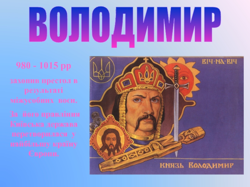 ВОЛОДИМИР980 - 1015 ррзахопив престол в результаті міжусобних воєн. За його правління Київська держава перетворилася у найбільшу країну Європи.