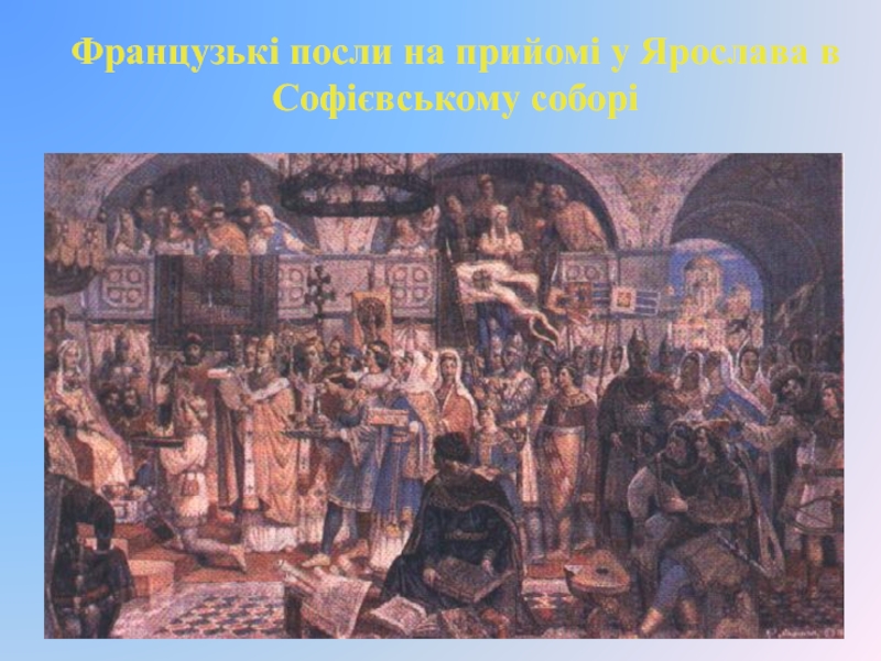 Слайд 7Французькі посли на прийомі у Ярослава в Софієвському соборі