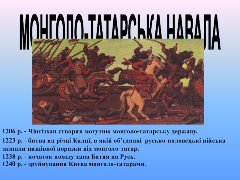 МОНГОЛО-ТАТАРСЬКА НАВАЛА1206 р. - Чінгізхан створив могутню монголо-татарську державу. 1223 р. - битва на річці Калці, в