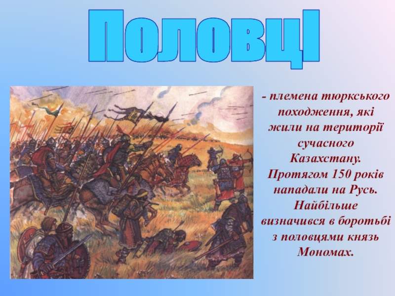Половці- племена тюркського походження, які жили на території сучасного Казахстану. Протягом 150 років нападали на Русь. Найбільше