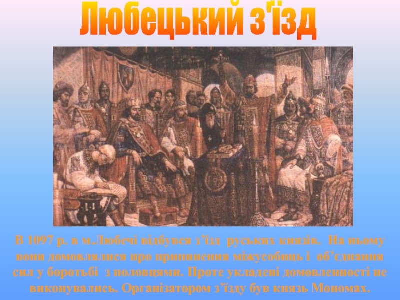 Любецький з'їздВ 1097 р. в м.Любечі відбувся з’їзд руських князів. На ньому вони домовлялися про припинення міжусобиць