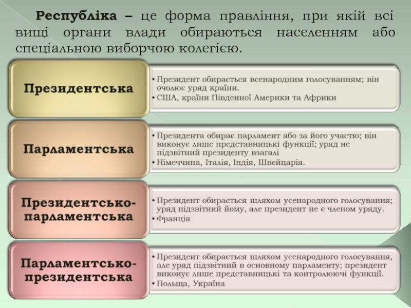 Слайд 4 Республіка – це форма правління, при якій всі вищі органи