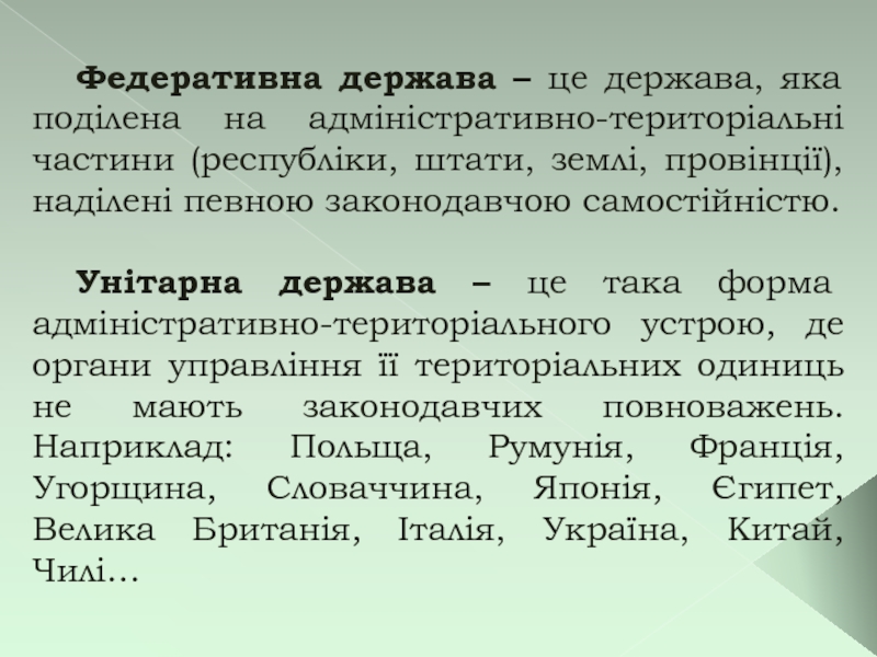 Слайд 16 Федеративна держава – це держава, яка поділена на адміністративно-територіальні частини