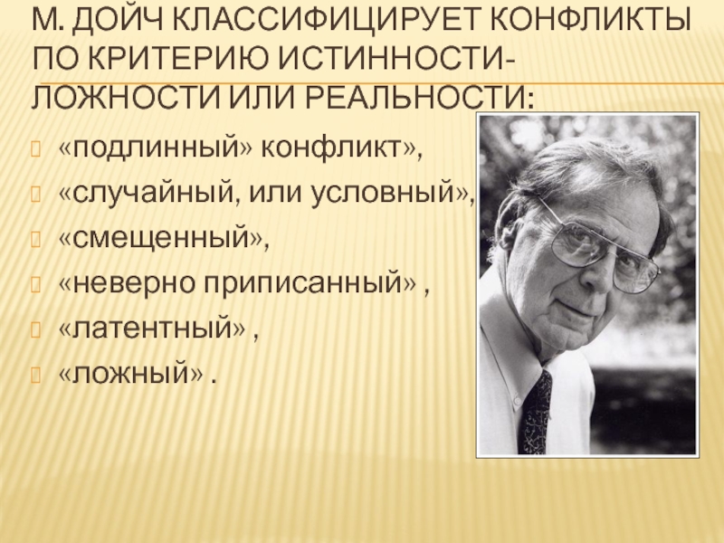 М. ДОЙЧ КЛАССИФИЦИРУЕТ КОНФЛИКТЫ ПО КРИТЕРИЮ ИСТИННОСТИ-ЛОЖНОСТИ ИЛИ РЕАЛЬНОСТИ: «подлинный» конфликт»,«случайный, или условный»,«смещенный»,«неверно приписанный» ,«латентный» ,«ложный» .