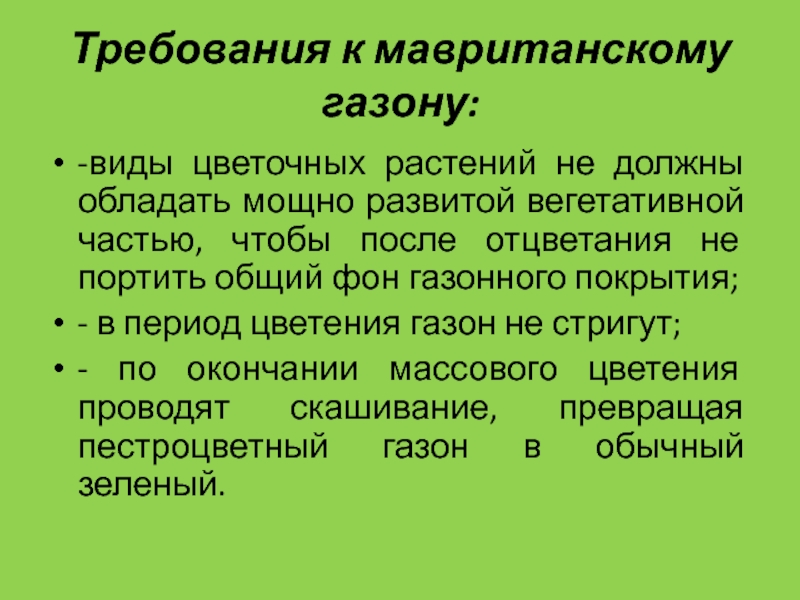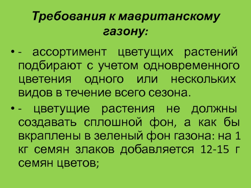 Слайд 42Требования к мавританскому газону: