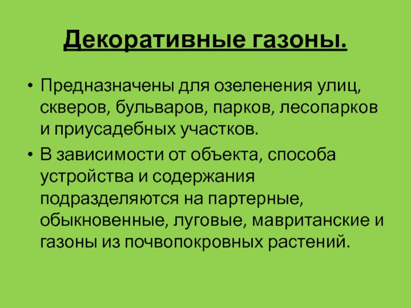 подразделяются на партерные, обыкновенные, луговые, мавританские и газоны из почвопокровных растений.