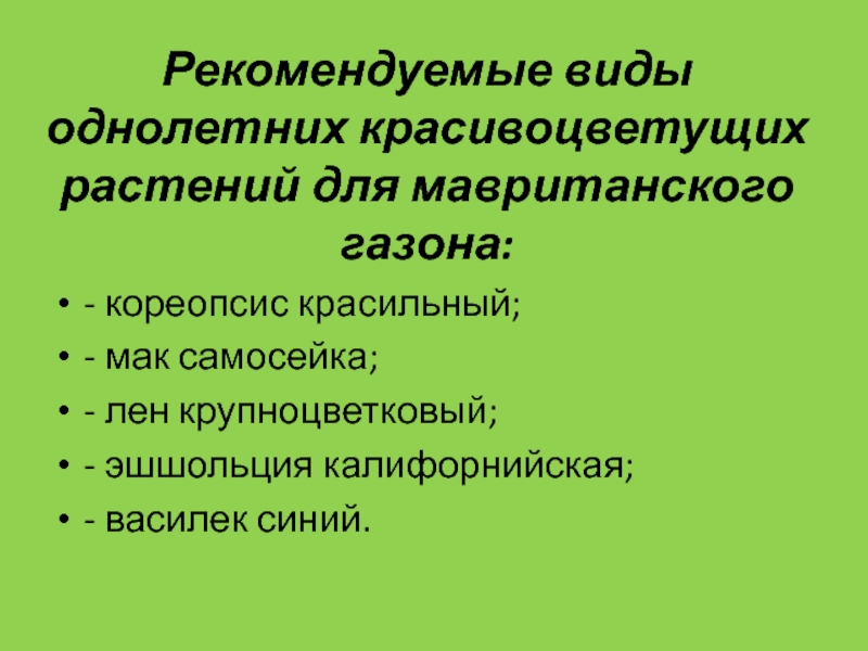 Слайд 44Рекомендуемые виды однолетних красивоцветущих растений для мавританского газона: