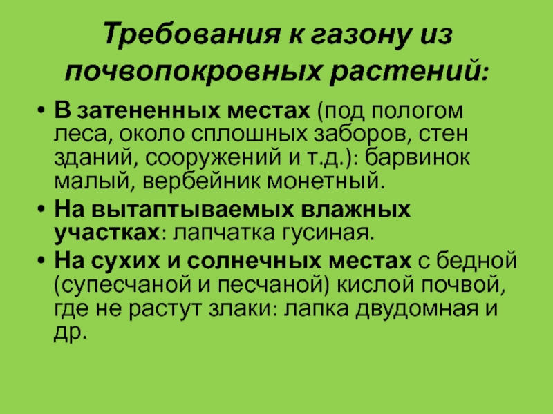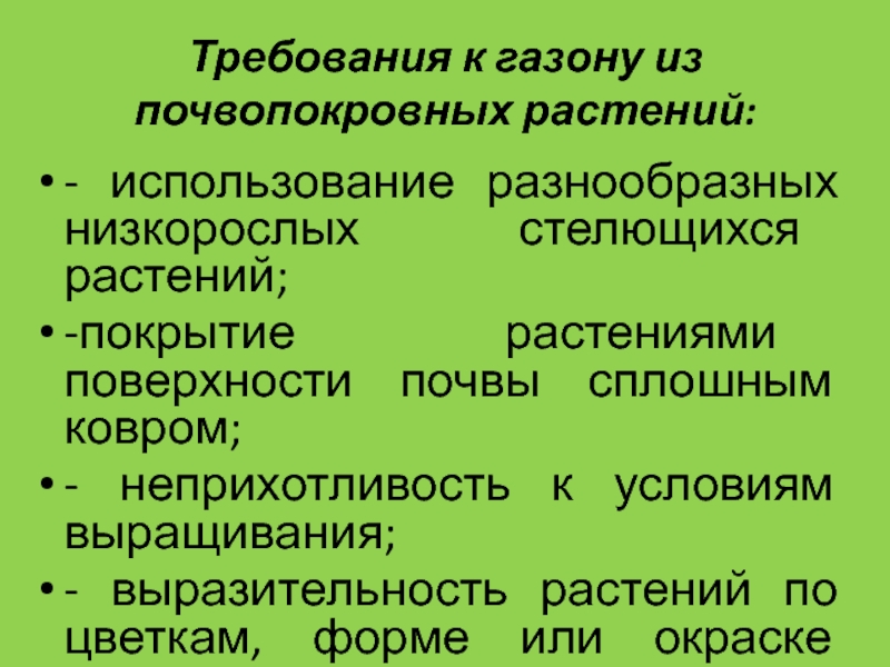 Слайд 54Требования к газону из почвопокровных растений: