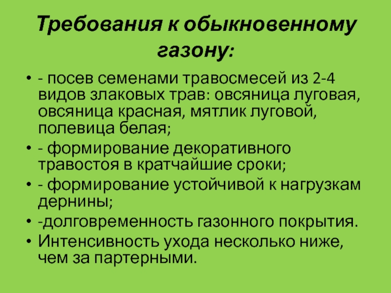 Слайд 27Требования к обыкновенному газону: