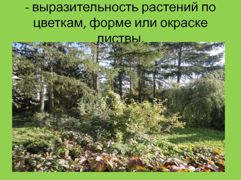 Слайд 59- выразительность растений по цветкам, форме или окраске листвы.