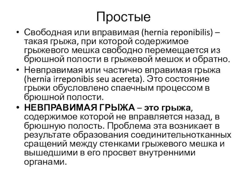 грыжевой мешок и обратно.Невправимая или частично вправимая грыжа (hernia irreponibis seu acereta). Это состояние грыжи обусловлено спаечным процессом в брюшной полости.