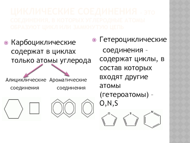 соединения – содержат циклы, в состав которых входят другие атомы (гетероатомы) –О,N,S