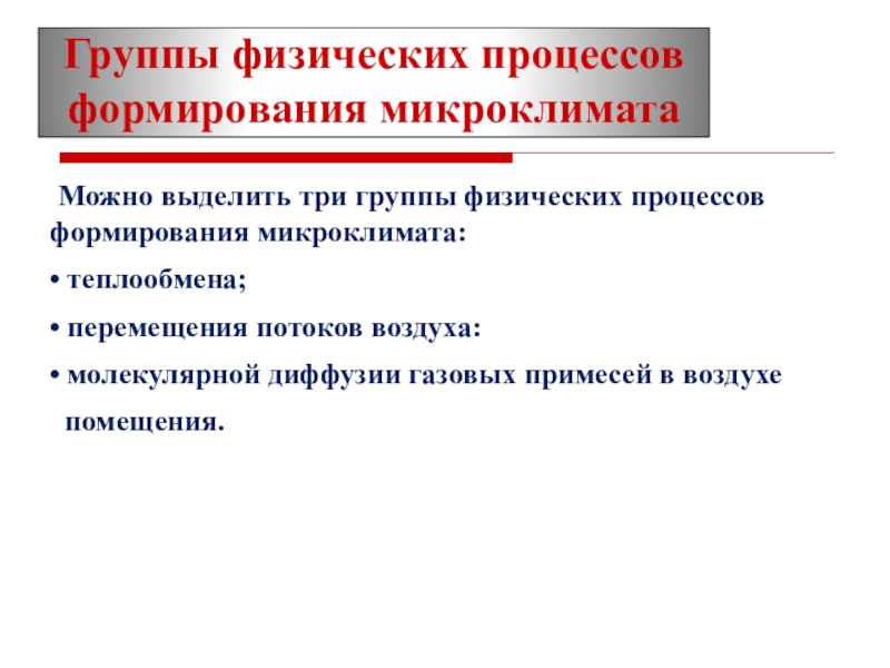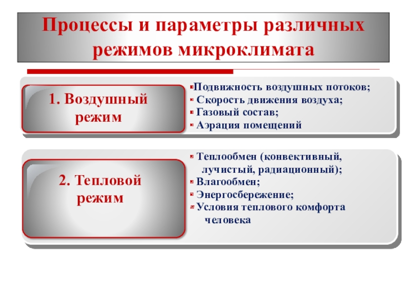Слайд 26Процессы и параметры различных режимов микроклимата