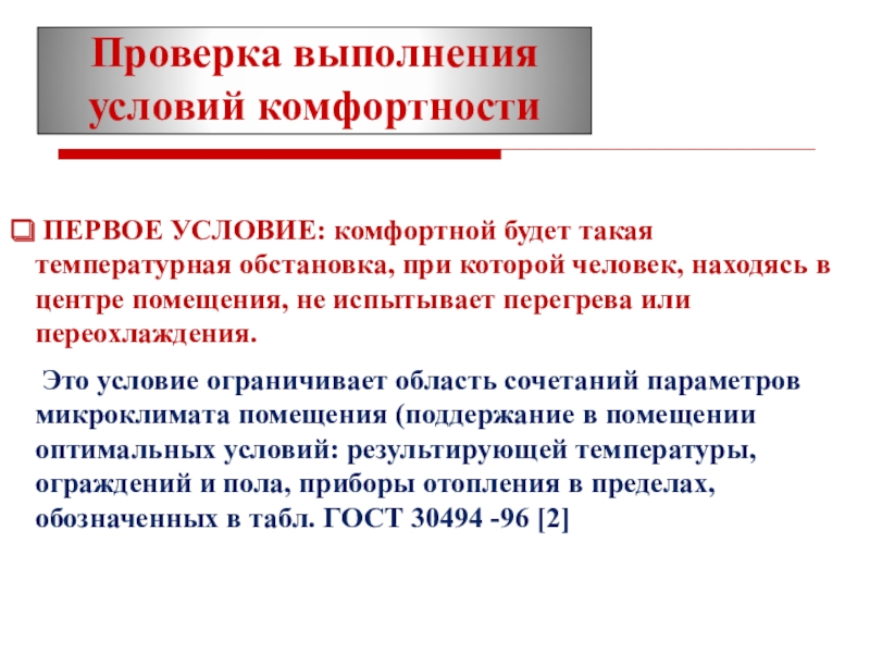 Это условие ограничивает область сочетаний параметров микроклимата помещения (поддержание в помещении оптимальных условий: результирующей температуры, ограждений и пола, приборы отопления в пределах, обозначенных в табл. ГОСТ 30494 -96 [2]