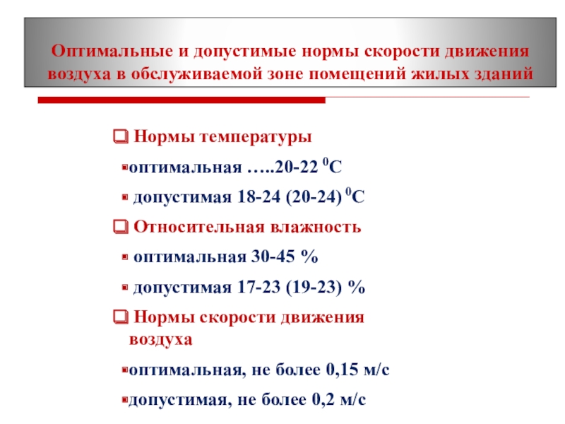 Оптимальные и допустимые нормы скорости движения воздуха в обслуживаемой зоне помещений жилых зданий
