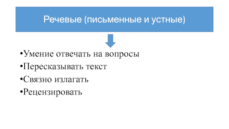 Умение отвечать на вопросыПересказывать текстСвязно излагатьРецензироватьРечевые (письменные и устные)