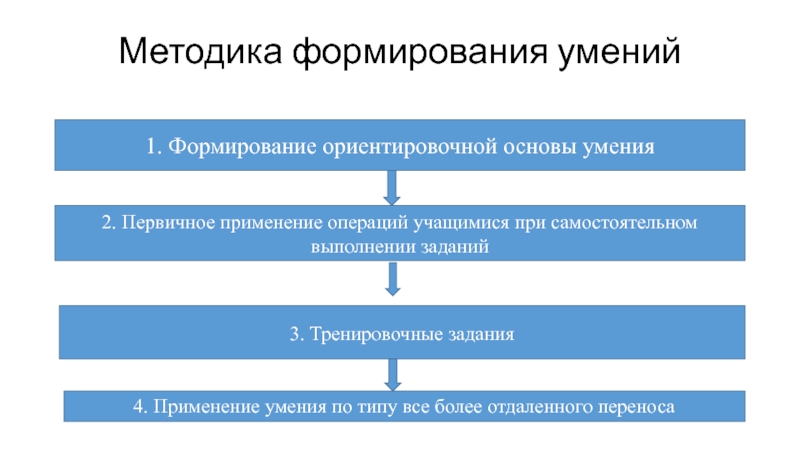 Методика формирования умений1. Формирование ориентировочной основы умения2. Первичное применение операций учащимися при самостоятельном выполнении заданий3. Тренировочные задания4.