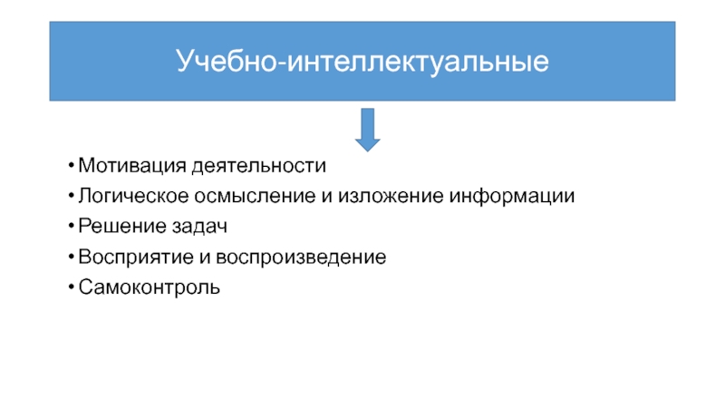 Мотивация деятельностиЛогическое осмысление и изложение информацииРешение задачВосприятие и воспроизведениеСамоконтрольУчебно-интеллектуальные