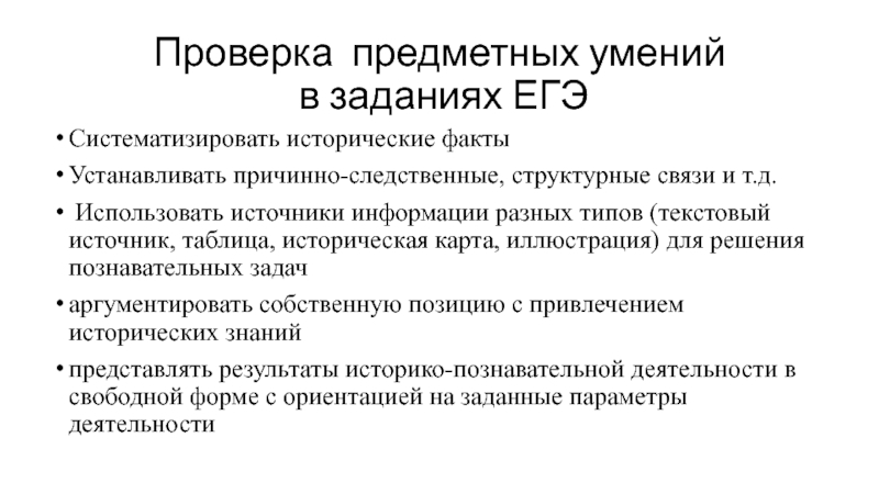 Проверка предметных умений  в заданиях ЕГЭСистематизировать исторические фактыУстанавливать причинно-следственные, структурные связи и т.д. Использовать источники информации