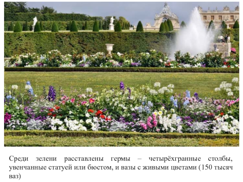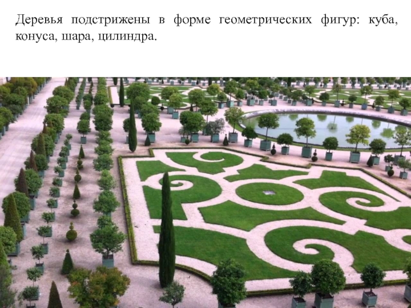 Слайд 18Регулярный французский парк поражает чёткостью линий, аллеи завершаются водоёмами, бассейны
