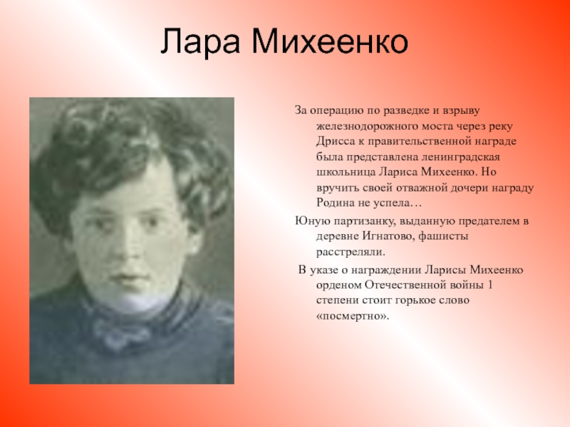 В указе о награждении Ларисы Михеенко орденом Отечественной войны 1 степени стоит горькое слово «посмертно».