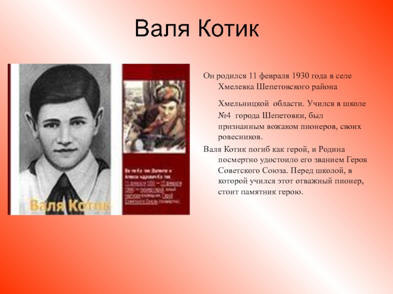 Валя Котик погиб как герой, и Родина посмертно удостоило его званием Героя Советского Союза. Перед школой, в которой учился этот отважный пионер, стоит памятник герою.