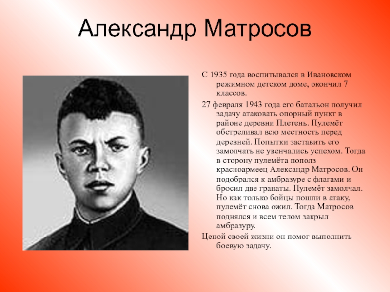 атаковать опорный пункт в районе деревни Плетень. Пулемёт обстреливал всю местность перед деревней. Попытки заставить его замолчать не увенчались успехом. Тогда в сторону пулемёта пополз красноармеец Александр Матросов. Он подобрался к амбразуре с флагами и бросил две гранаты. Пулемёт замолчал. Но как только бойцы пошли в атаку, пулемёт снова ожил. Тогда Матросов поднялся и всем телом закрыл амбразуру.