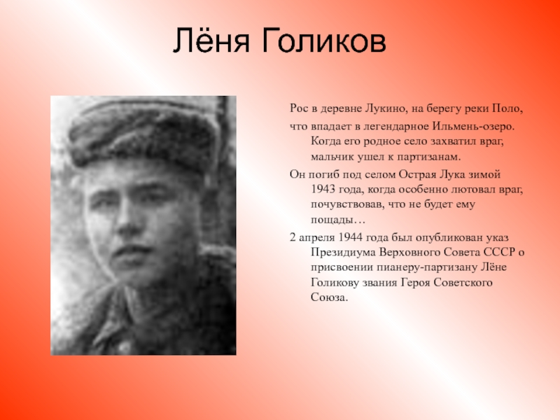 2 апреля 1944 года был опубликован указ Президиума Верховного Совета СССР о присвоении пианеру-партизану Лёне Голикову звания Героя Советского Союза.