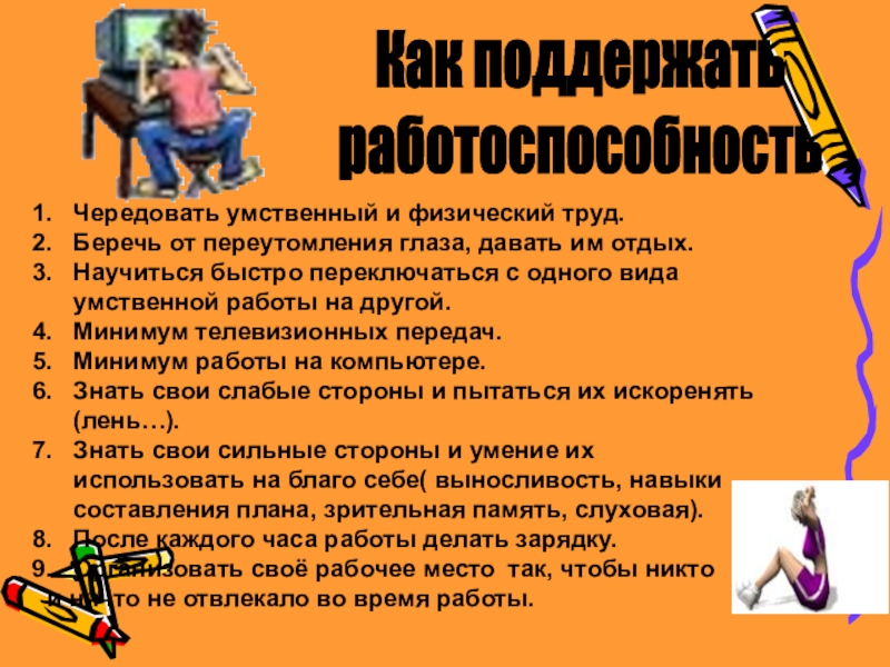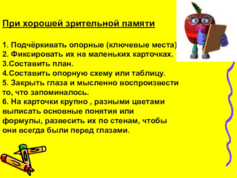Знать свои сильные стороны и умение их использовать на благо себе( выносливость, навыки составления плана, зрительная память, слуховая).
