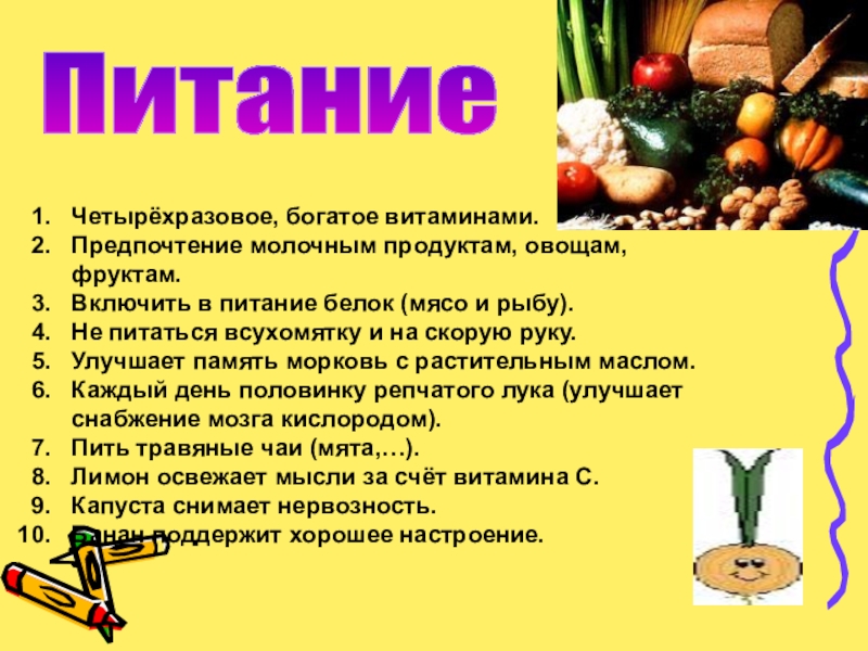 Каждый день половинку репчатого лука (улучшает снабжение мозга кислородом).