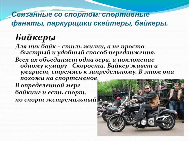 Слайд 9Связанные со спортом: спортивные фанаты, паркурщики скейтеры, байкеры.