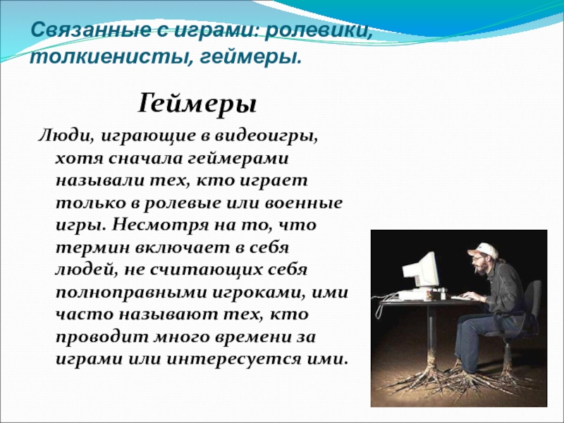Слайд 11Связанные с играми: ролевики, толкиенисты, геймеры.