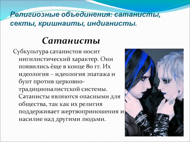 - Религиозные объединения: сатанисты, секты, кришнаиты, индианисты.