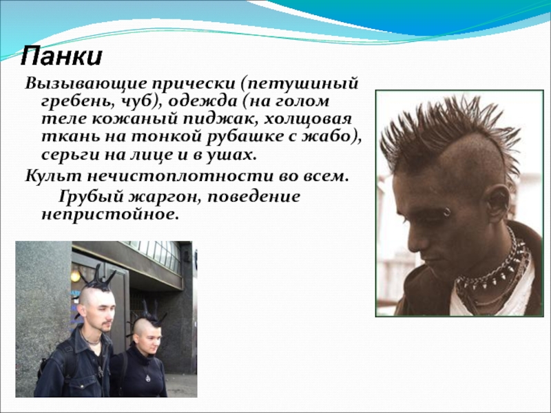Вызывающие прически (петушиный гребень, чуб), одежда (на голом теле кожаный