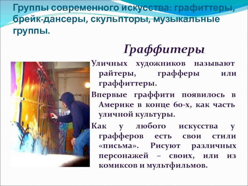 Слайд 13Группы современного искусства: графиттеры, брейк-дансеры, скульпторы, музыкальные группы.