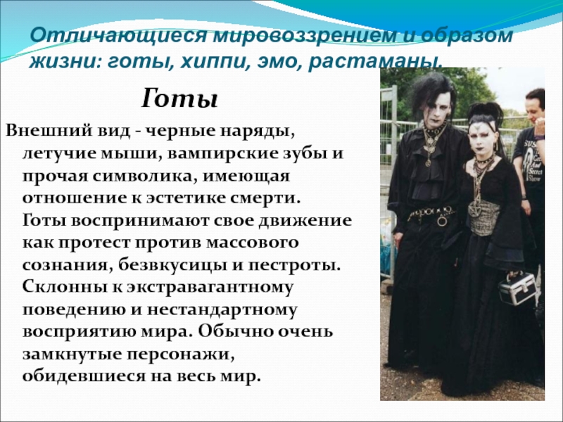 Слайд 5Отличающиеся мировоззрением и образом жизни: готы, хиппи, эмо, растаманы.