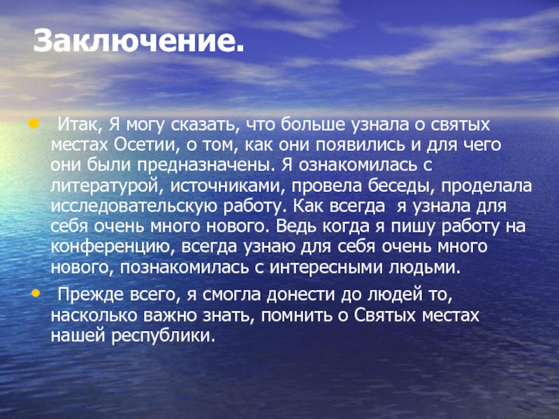 Заключение. 	Итак, Я могу сказать, что больше узнала о святых местах Осетии, о том, как они появились